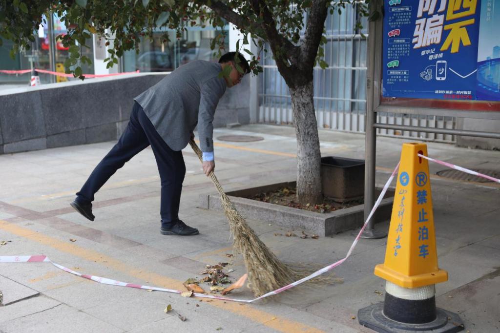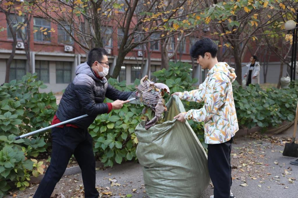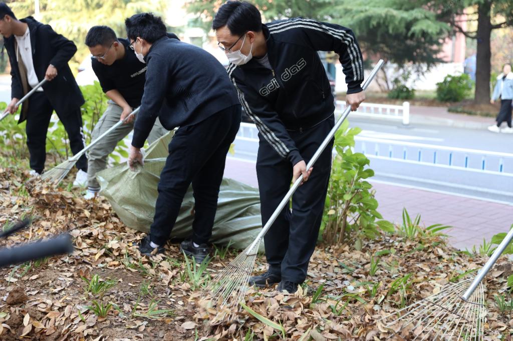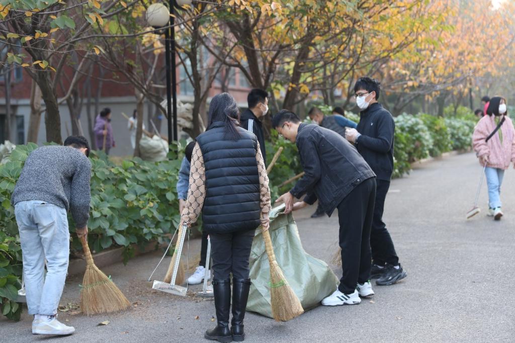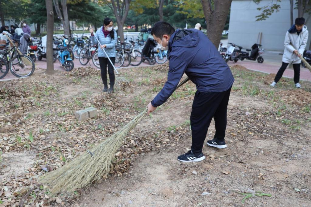 师生们分工合作,带着铁锨、扫帚等工具对区域内的落叶、杂物、垃圾进行了清理,并集中摆放了学院周边的自行车和电动车,维护了校园的干净整洁。