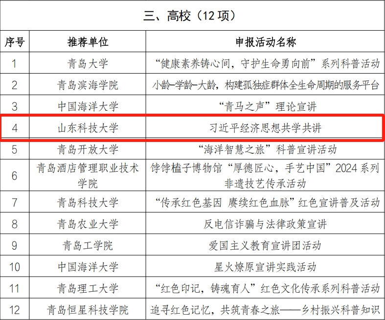 近日,青岛市社科联公布2024年度重点社科普及活动资助项目名单,我院申报的“习近平经济思想共学共讲”项目成功入选,也是学校唯一获批项目。