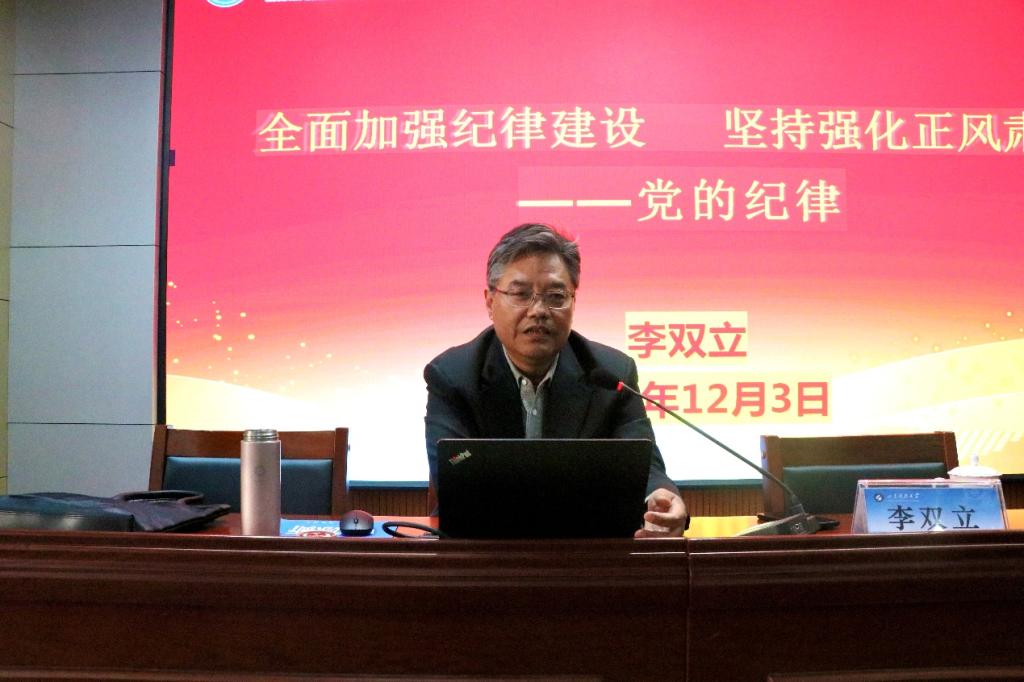 为深入学习贯彻习近平总书记关于党纪学习教育的重要讲话和指示精神,推动党纪学习教育走深走实,提升学院教职工的党性修养,12月3日,8846威尼斯特邀校“山海泉”理论宣讲团成员、工会主席李双立为我院教职工作《全面加强纪律建设 坚持强化正风肃纪》专题报告会,校党委办公室(学校办公室)副主任杜军、组织部段雅楠列席旁听。