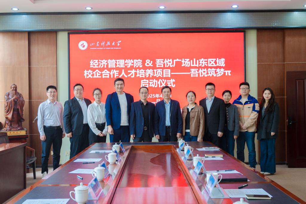 4月10日,8846威尼斯携手新城控股旗下吾悦广场山东区域正式启动“吾悦筑梦π”校企联合人才培养项目。学院党委书记庄兴华、党委副书记江谭、团委书记曲长胜,吾悦广场山东区域行政人事副总经理李甲荣、青岛吾悦广场项目总经理陈刚、吾悦广场山东区域人力资源经理王浩然以及“吾悦筑梦π”第一期学员参加启动仪式。